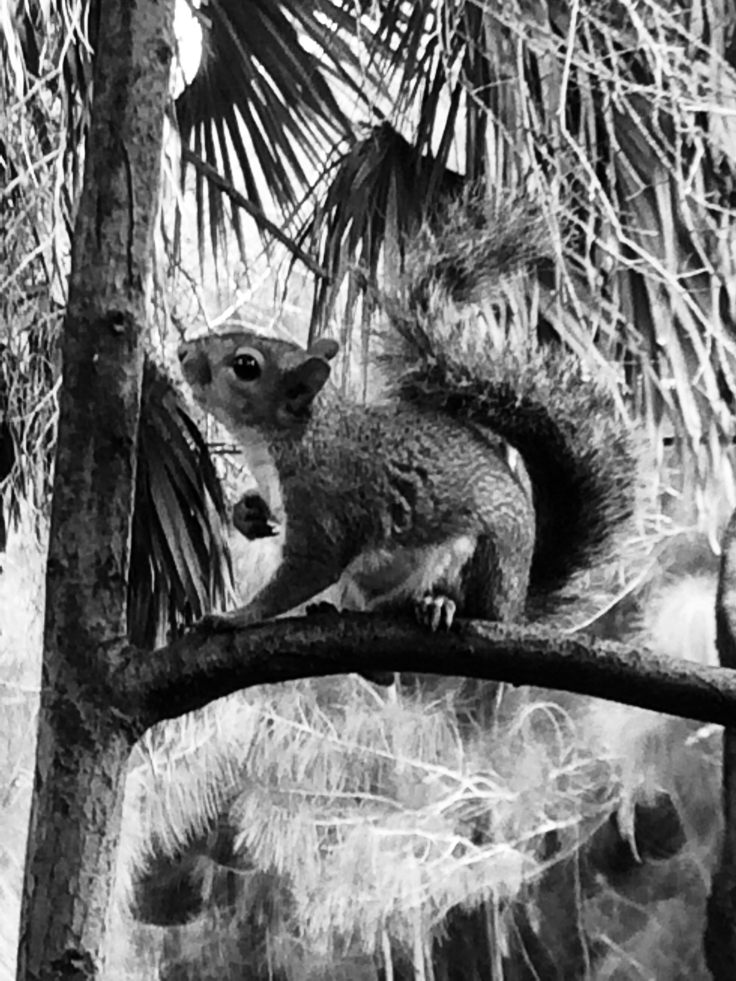Not a coconut; cabbage palms don’t grow them. Not a dead bird, or a broken branch, or a cluster of palm berries, like he might have expected, but… a squirrel!